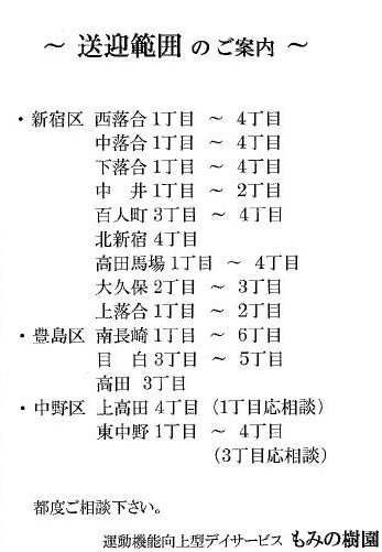 北新宿高齢者在宅サービスセンター デイサービス 東京都新宿区の加算体制や対応時間、クチコミ情報などの詳しい情報を掲載しています。介護施設・介護事業所をお探しの際にお役立て 送迎サービスの提供地域. 運営方針. 事業所の通所介護従事者は, |
